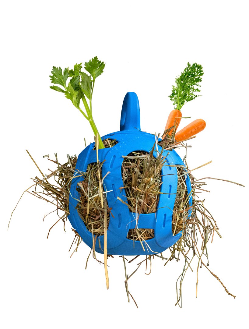Vul de Jolly Hay Ball met hooi en vul de kleinere openingen met lekkers zoals appel of wortel. Zo is je paard wel even zoet.
