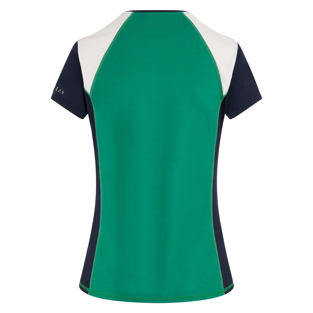 Sportief T-shirt met modieuze colourblockings in drie kleuren of in een effen variant. Het getailleerde model zorgt samen met de contrastkleurige zijkanten voor een slanke look. Het T-shirt van functioneel materiaal heeft een contrastkleurig afgezette V-hals en is afgewerkt met opvallende naden. Links op de borst bevindt een reflecterende print van het paardenlogo en op de linkermouw de logotekst. Het shirt met korte mouwen is afgewerkt met een logotape binnenin bij de nek. De onderrand is recht aan de voorkant en mooi afgerond aan de achterkant. De stof voelt aangenaam aan op de huid en transporteert het vocht weg van het lichaam, ideaal dus voor hoge inspanningen en langdurig rijplezier.